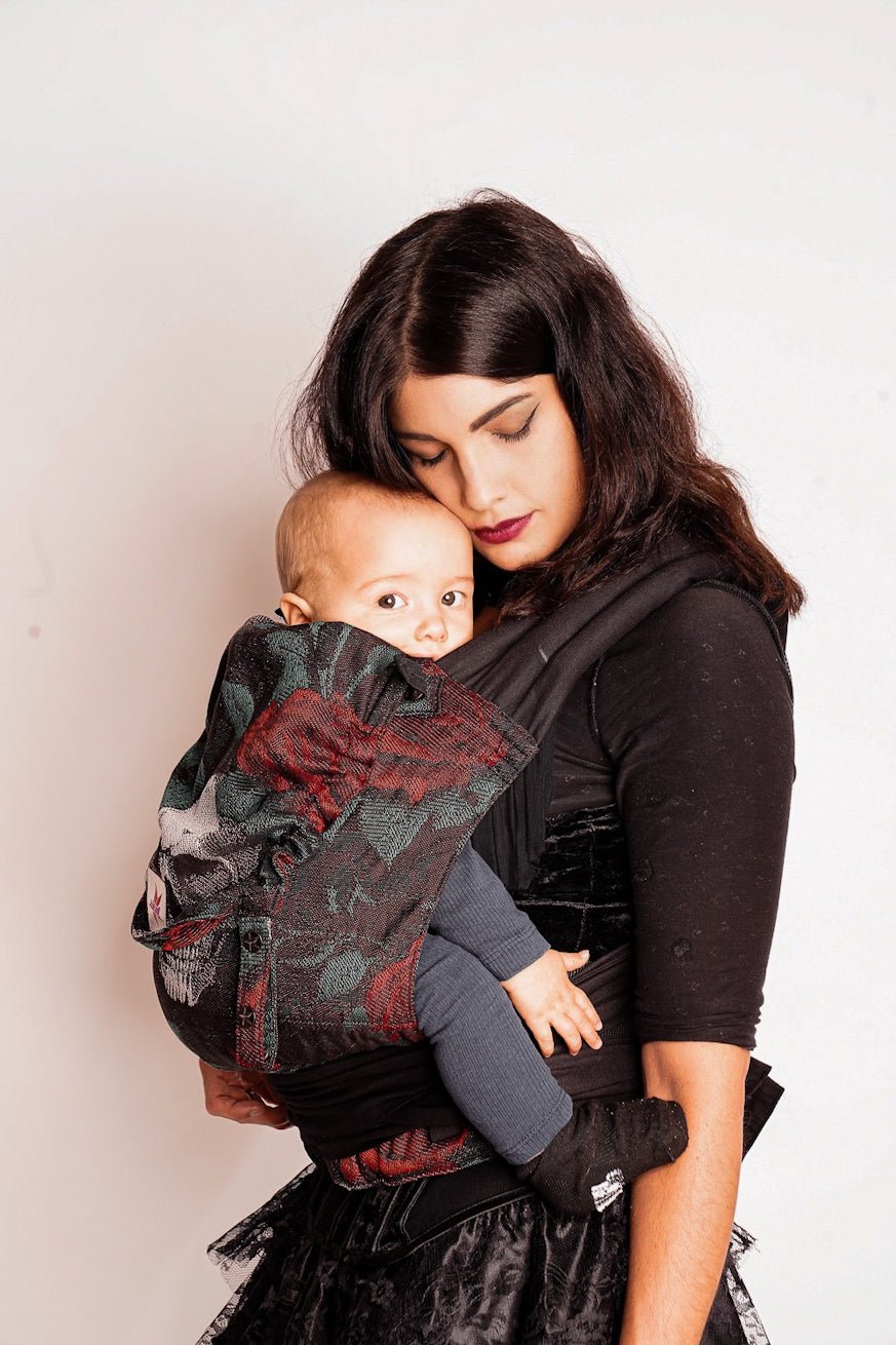 Bring Rock’n’Roll in deinen Alltag mit der TaiTai-Babytrage im „Skulls N Roses“-Design! Die gepolsterten Träger zum
