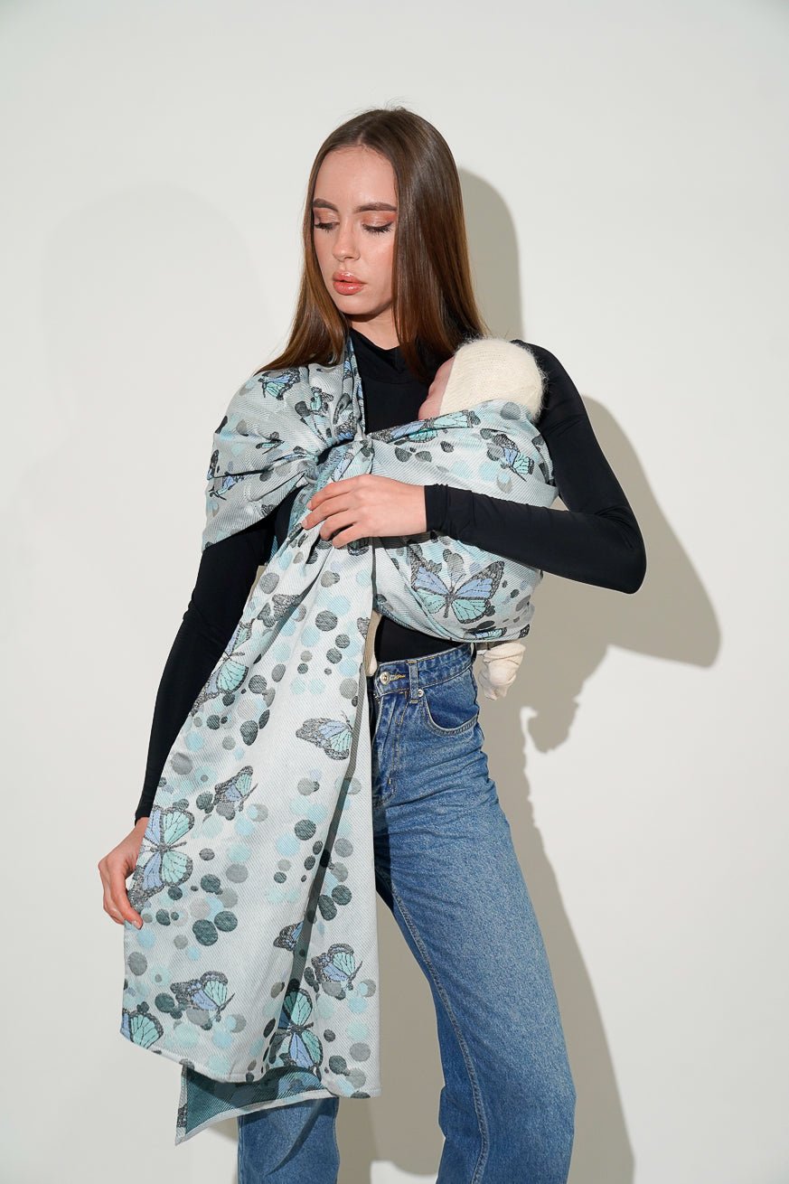 Entdecke die zauberhafte Welt von Mariposa Marbella – unserer limitierten Babytrage in Blau-Türkis auf zartem Off-White mit Schmetterlingsdesign. Ein echter Blickfang und das IT-Piece der Saison.