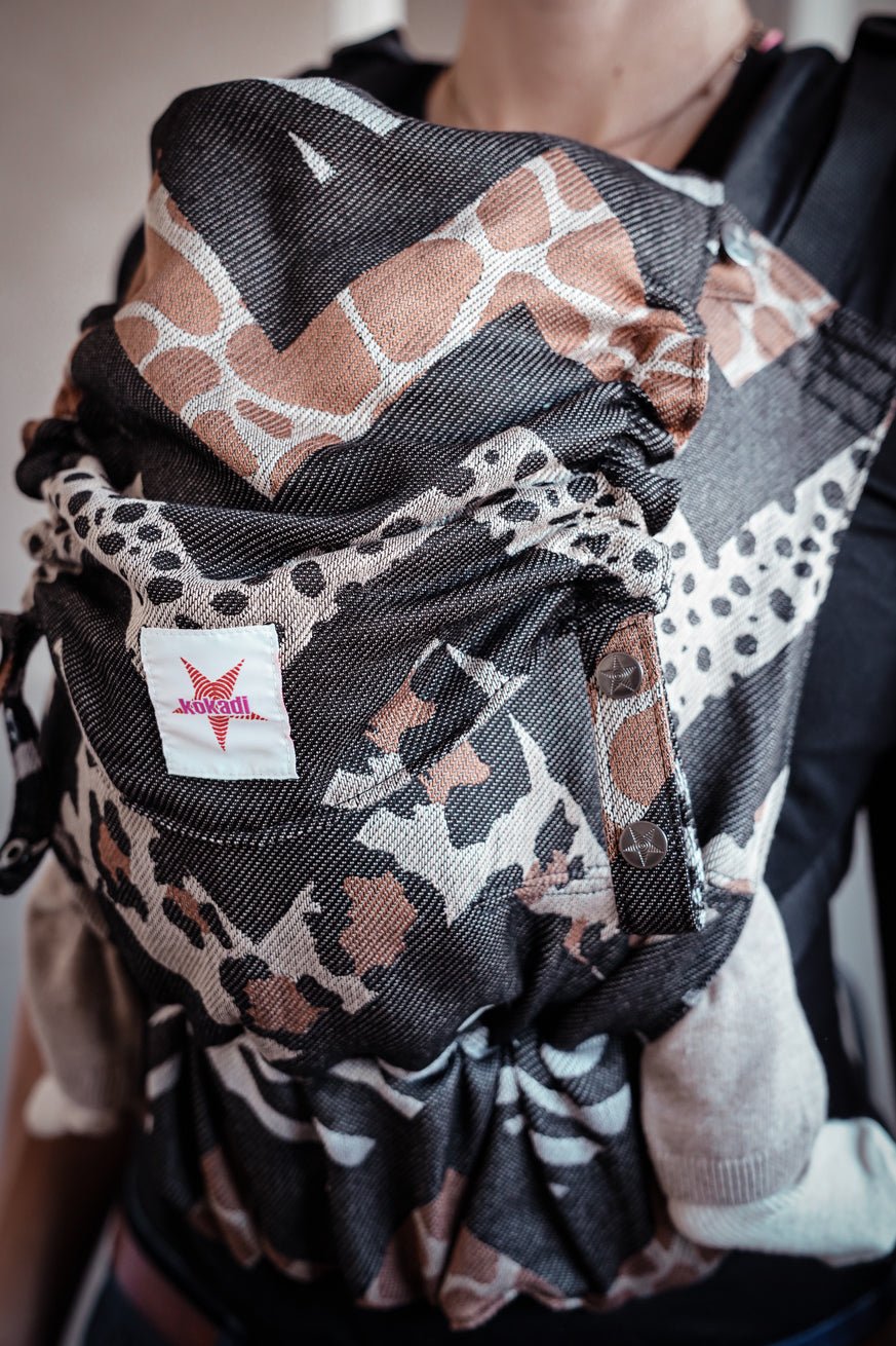 Con il marsupio di animali selvatici Ariane, Kokadi presenta un punto culminante per tutte le mamme di moda. Il trasportatore ergonomico è particolarmente morbido e conveniente a causa dell'ascensore jacquard da 60 % micromodale e del 40 % di cotone organico. La combinazione unica di diverse stampe animali lo rende un vero eyatcher e un design senza tempo.